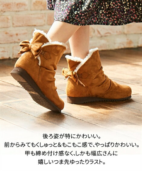 ブーツ 大きいサイズ レディース ゆったり幅 つま先ゆったり バックリボン ショートブーツ 低反発中敷 ワイズ4E キャメル/黒 23.0〜23.5/24.0〜24.5/25.0〜25.5/26.0〜26.5cm ニッセン nissen