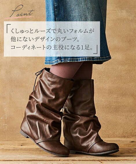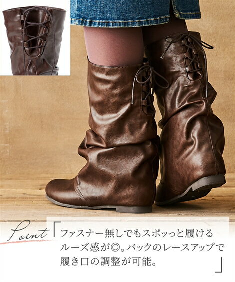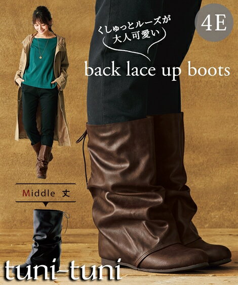 靴(シューズ) 【ゆったり幅広】くしゅっとしたルーズなバックレースアップミドルブーツ(低反発中敷)(ワイズ4E)