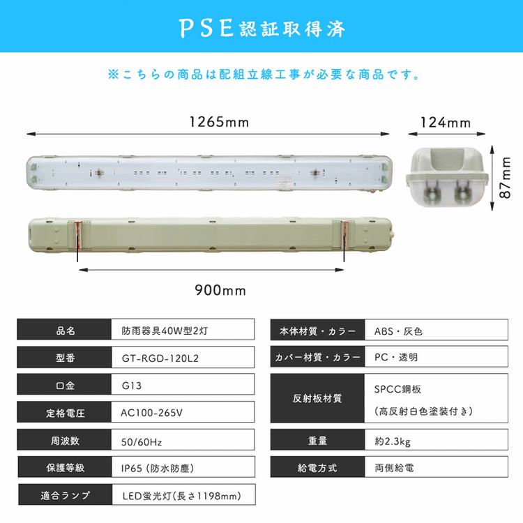 ) [器具仕様] ・品名:防雨器具40W型2灯式 ・型番:GT-RGD-120L2 ・定格電圧:AC100-265V 50/60Hz ・口金:G13 ・サイズ(mm):長さ1265×幅124×高さ87(取り付け間隔は900mm) ・保護等級:IP65 (防水防塵) ・本体カラー:灰色 ・カバーカラー:透明 ・本体材質:ABS ・カバー材質:PC ・反射板材質:SPCC鋼板(高反射白色塗装付き) ・重量:約2.3kg ・給電方式:両側給電 ・PSE認証取得済 ※こちらの商品は配組立線工事が必要な商品です。