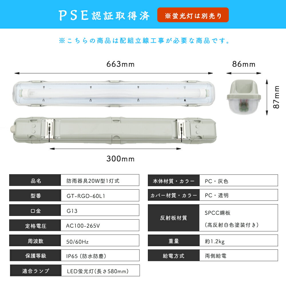 仕様 ・型番:GT-RGD-60L1 ・定格電圧:AC100-265V 50/60Hz ・口金:G13 ・サイズ(mm):長さ663×幅86×高さ87(取り付け間隔は300mm) ・保護等級:IP65 (防水防塵) ・本体カラー:灰色 ・カバーカラー:透明 ・本体材質:PC ・カバー材質:PC ・反射板材質:SPCC鋼板(高反射白色塗装付き) ・重量:約1.2kg ・給電方式:両側給電 ・適合ランプ:LED蛍光灯(長さ580mm) ※蛍光灯は別売り ・PSE認証取得済 ※こちらの商品は配組立線工事が必要な商品です。